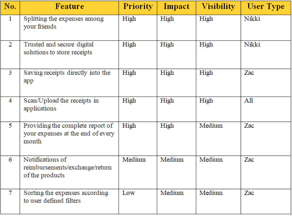 How the feature matrix helped: The feature matrix helped to synthesize the results into the matrix. The feature Matrix highlights the priority level of a required feature in an application based on survey data.
