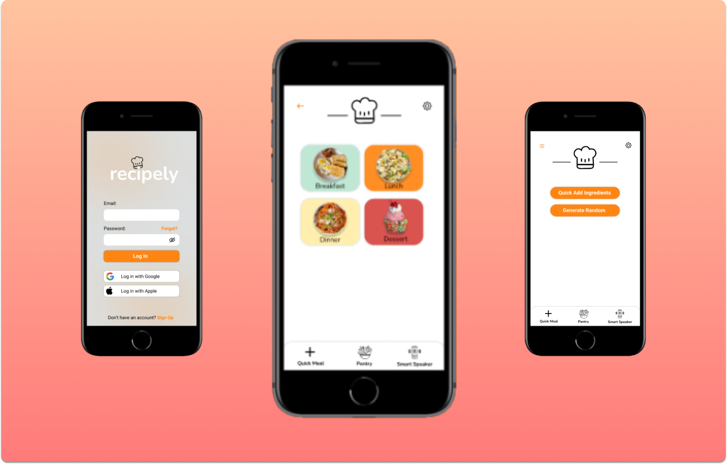 After developing personas and scenarios, we brainstormed some low-fidelity prototype ideas to help us visualize our concepts. The app's initial key features include a pantry, editing, and saving recipes, and viewing the screens on a smart speaker.